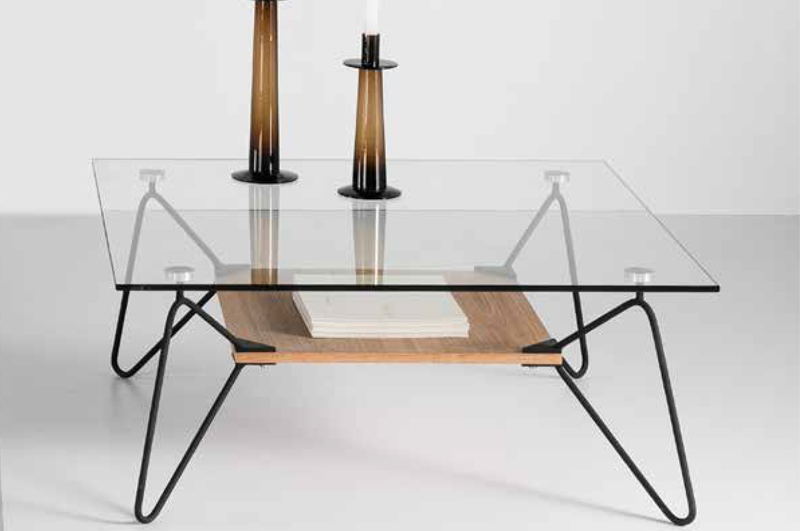 Table basse design avec double plateau, dessus en verre et dessous en bois. Structure acier chromé ou acier noir.