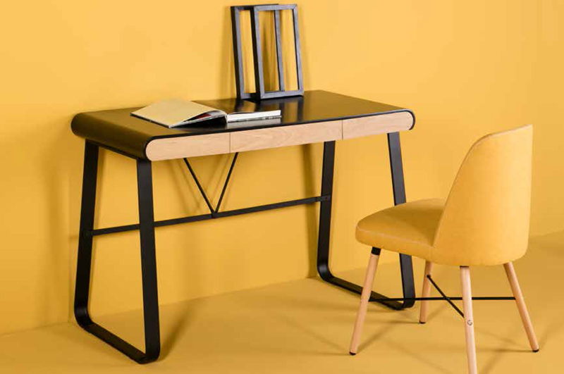 Bureau design, tiroir central. Plateau bois et structure acier. Existe en coloris noir ou blanc. Tiroir et champ en bois clair.