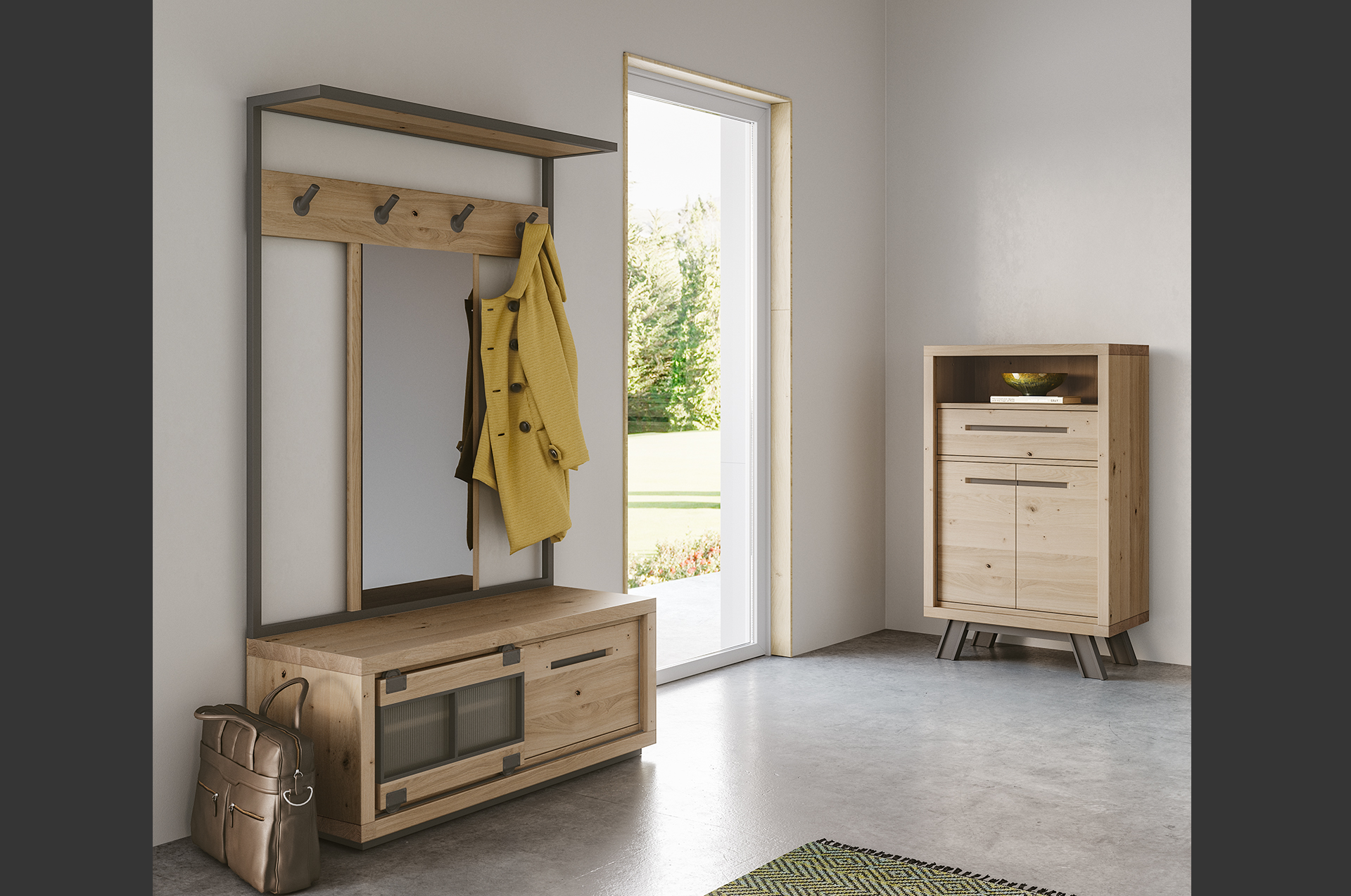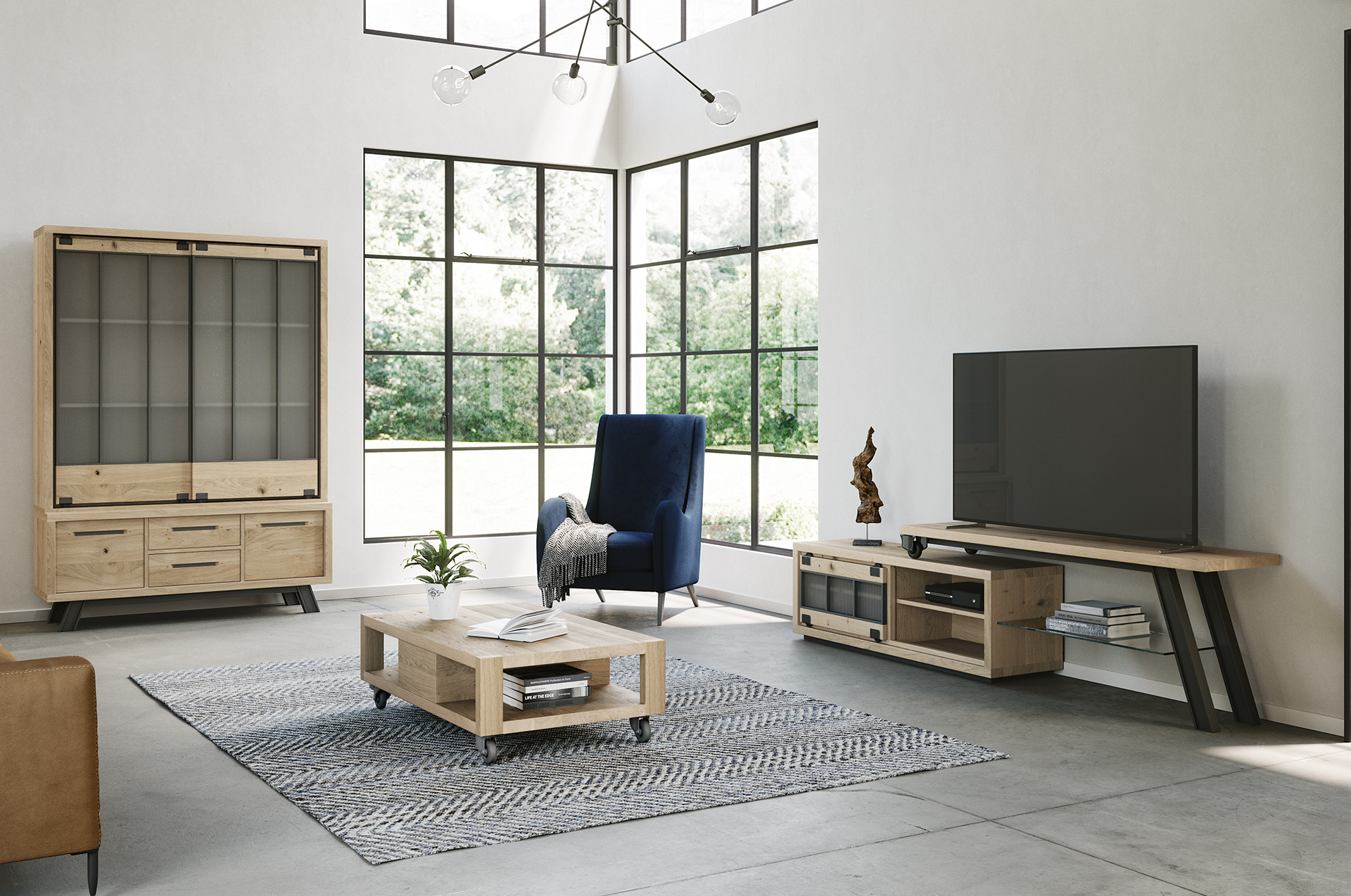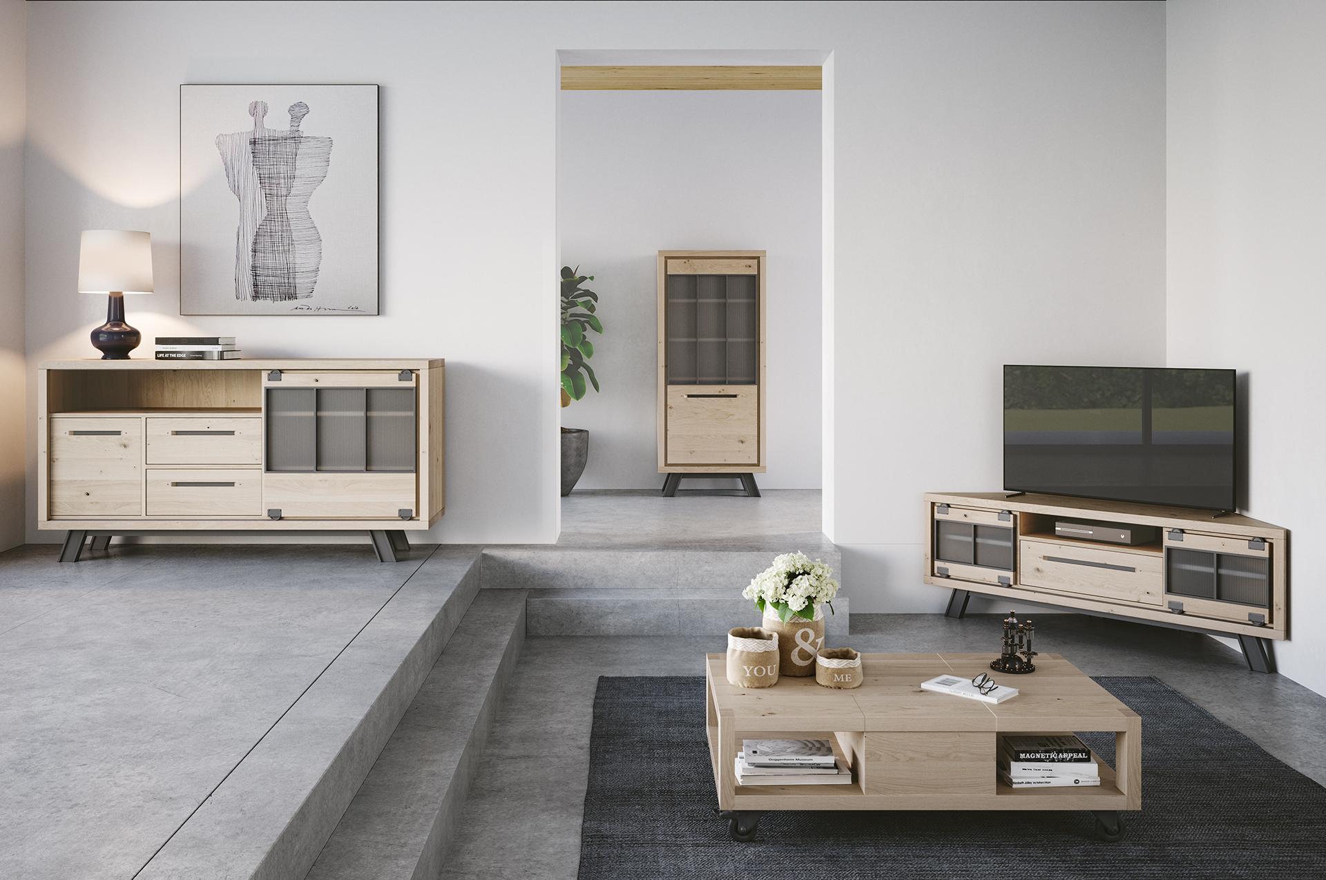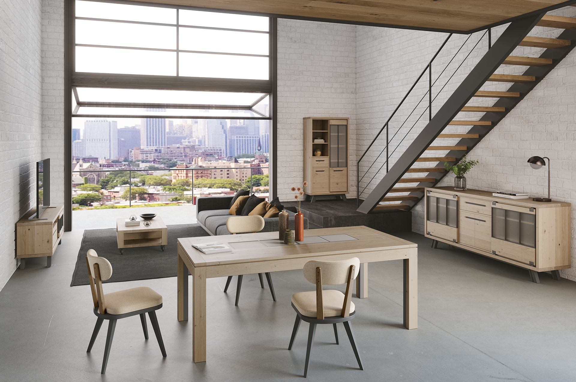 Salle à manger cocooning. La table est disponible avec différents pieds. Chaque élément peut être vendu séparément. Possibilité de combiner cette salle à manger avec le meuble TV et la table basse de la même collection.
