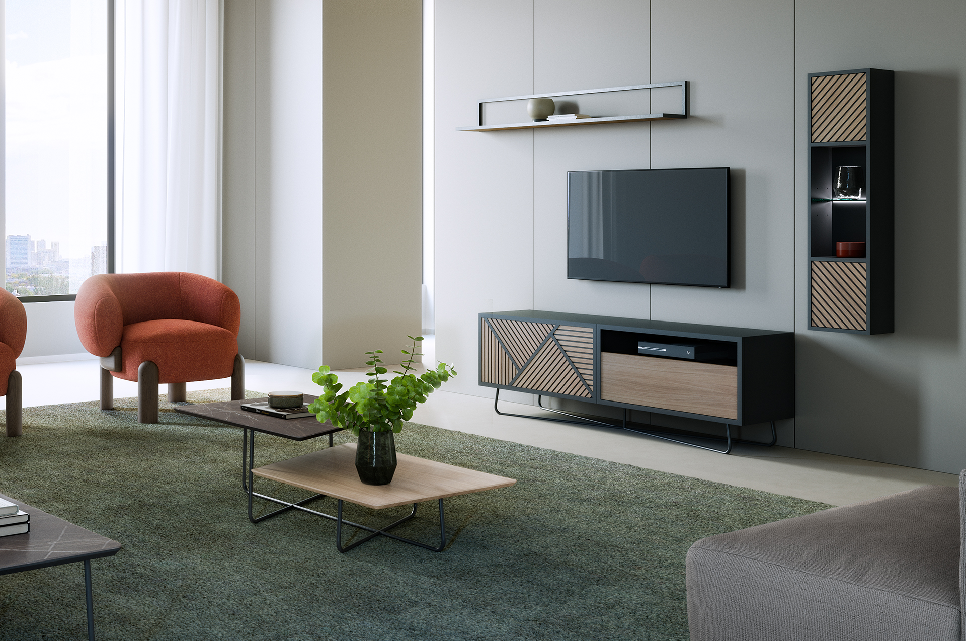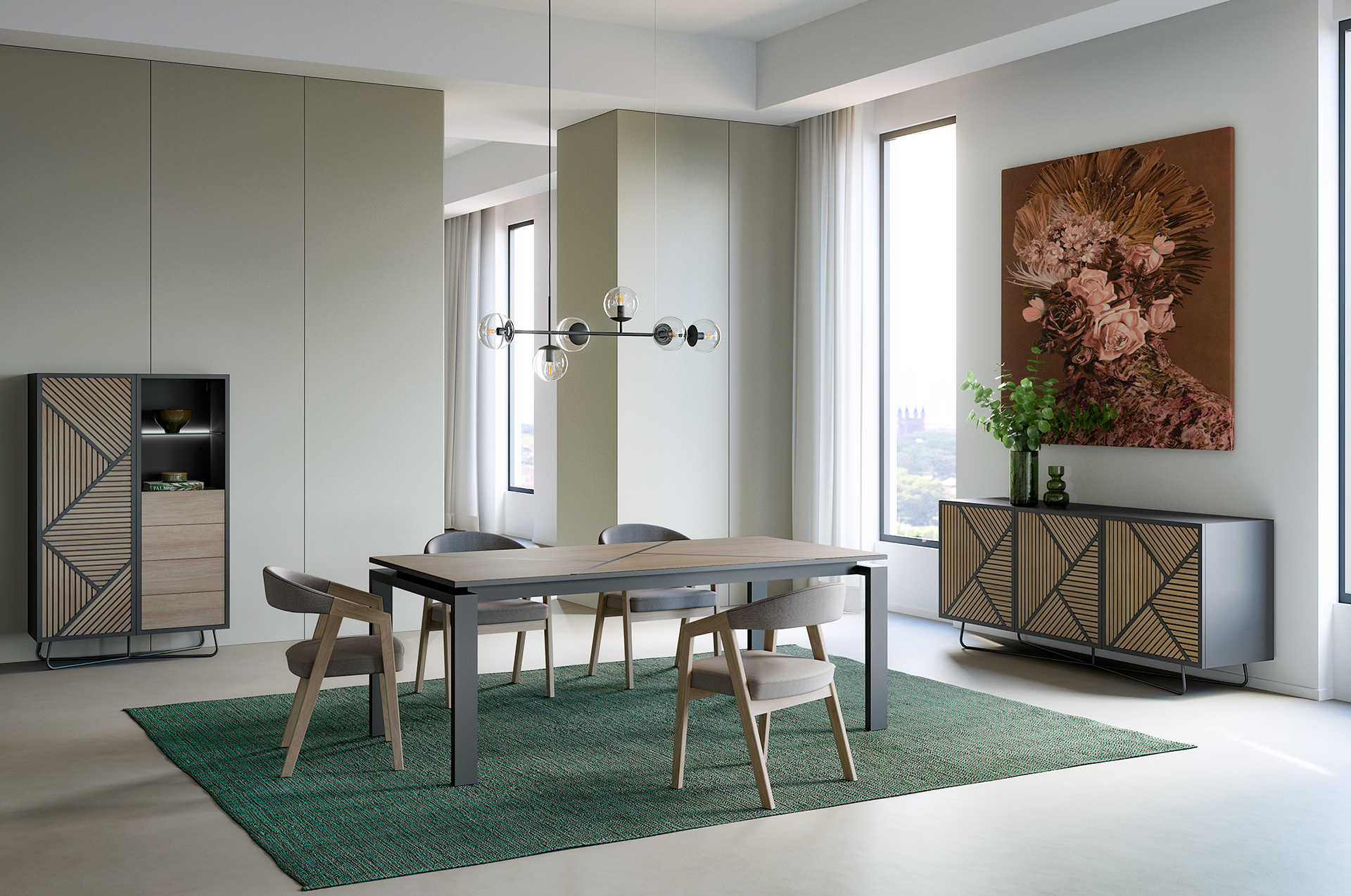 Salle à manger cocooning. La table est disponible avec différents pieds. Chaque élément peut être vendu séparément. Possibilité de combiner cette salle à manger avec le meuble TV et la table basse de la même collection.