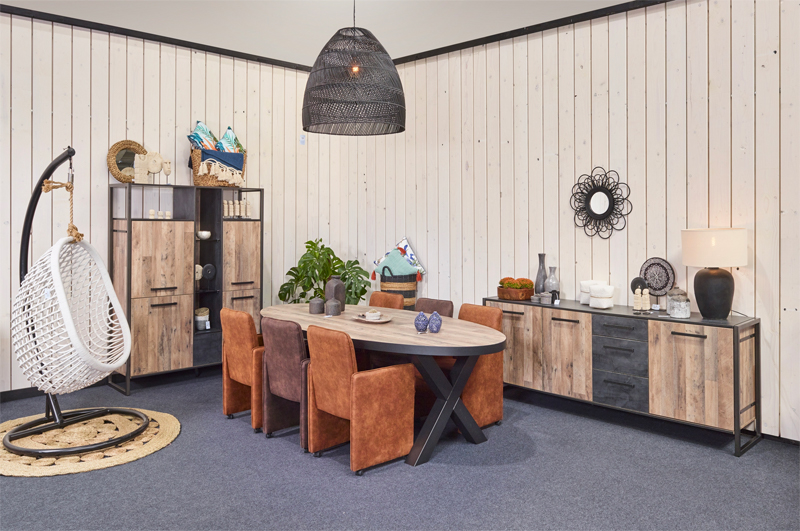 Cette salle à manger moderne est réalisée en décor bois du navire noir et finie avec des détails aspect acier pour apporter une touche industrielle. Elle existe en deux teintes. Chaque élément peut être vendu séparemment.